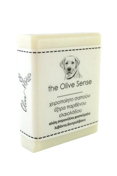 A white bar of pet soap with a label featuring a dog and the text 'The OliveSense Pet Soap Bar, extra virgin olive oil, 100% all natural ingredients, deep cleanses, hydrates, offers natural anti-parasitic